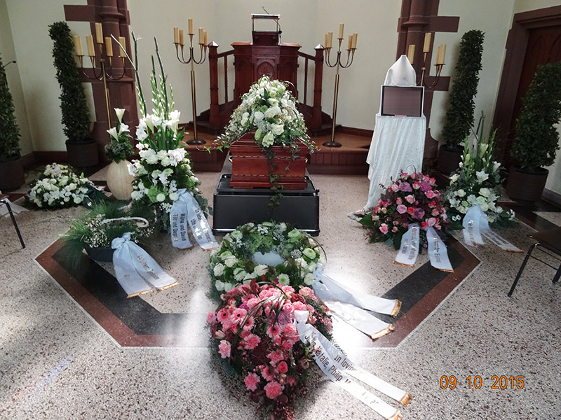Wir fertigen den Blumenschmuck rund um die Trauerfeier individuell und nach Ihren Wünschen.